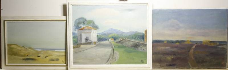 Woning in berglandschap , ruiters in heidelandschap en ruiters in de duinen