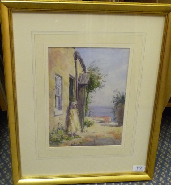 A young girl at the door of Ivy Cottage and Jubilee Cottage, Runswick Bay