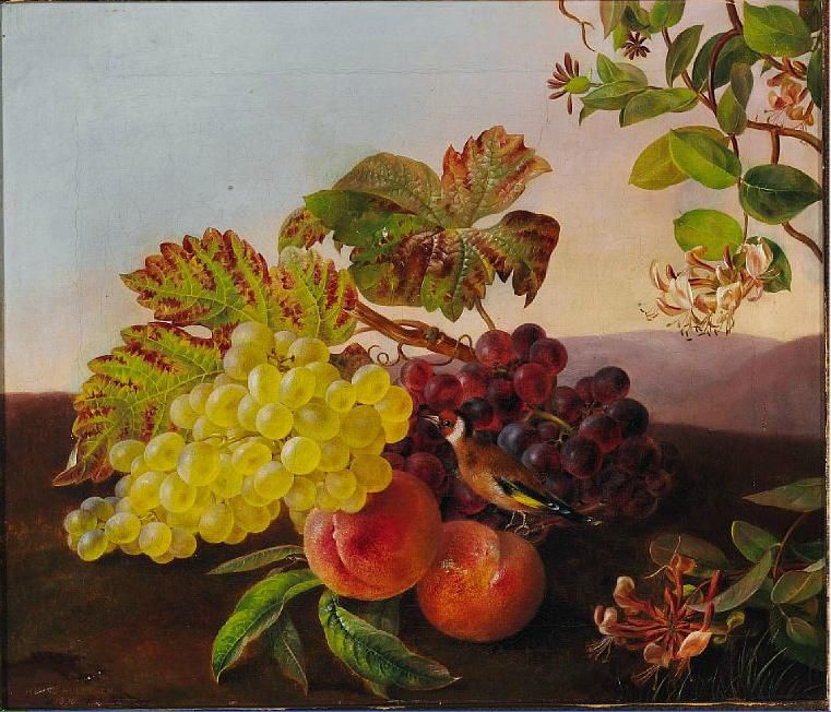 Still life with a goldfinch, grapes and peaches