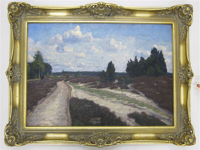 | Heathland, an Impressionist landscape with a country road running through shrubs and trees | |