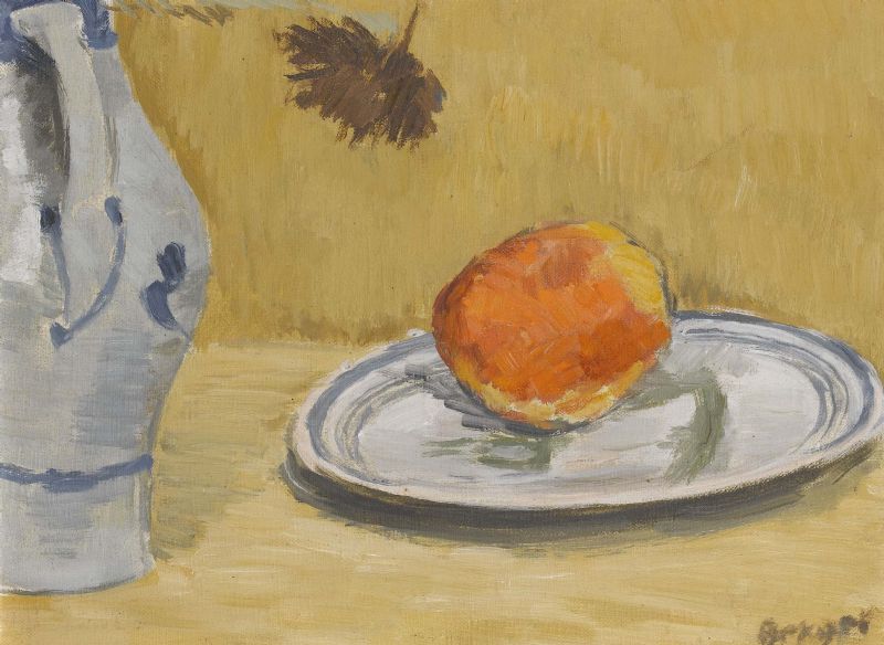 Stillleben mit Apfel, Zinnteller und Steinzeugkrug.