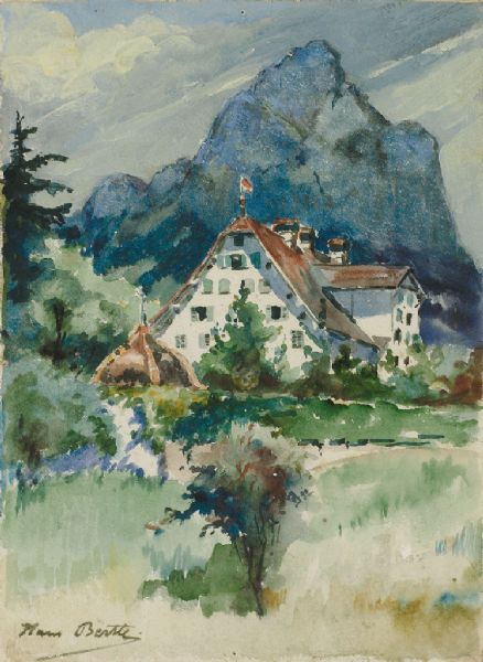 Großes Gehöft vor steil aufragendem Felsmassiv. Aquarell auf Papier.