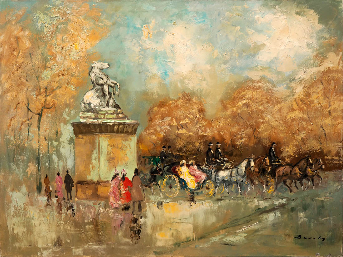 Kutschenparade in einem Pariser Park mit reicher Figurenstaffage