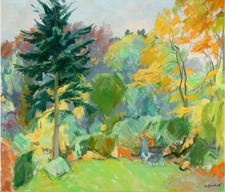 | Forest scene with woman taking her dog for a walk | |