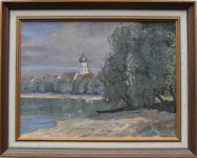 ''Blick auf Allensbach''; mit Kirche; vom Wasser aus gesehen; rechte Bildseite eine Baumgruppe