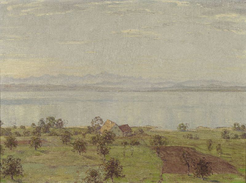 | Blick über Streuobstwiese und malerisches Gehöft auf den Bodensee an einem sonnigen Frühlingsmorgen | |