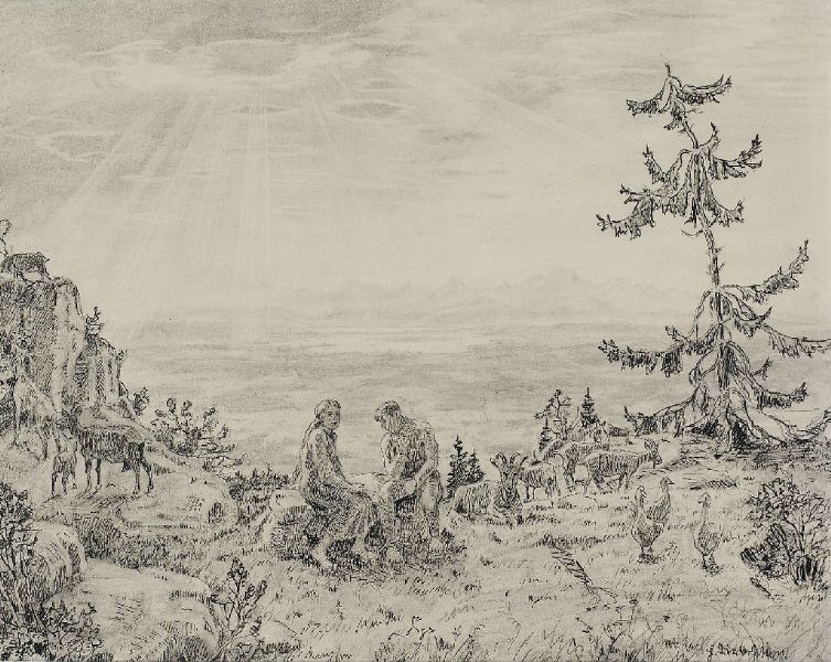 | Blick vom Hegau auf den Bodensee und Gebirge. Im Vordergrund junges Hüterpaar mit Ziegen und Gänsen | |