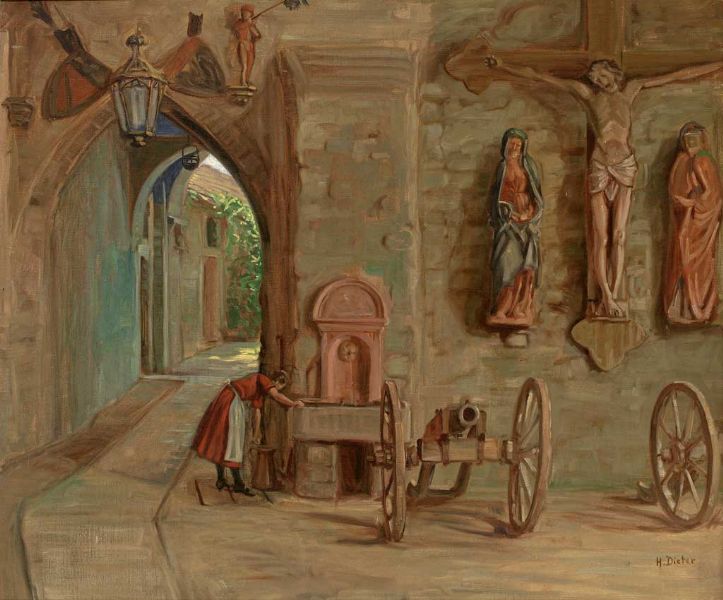 Gotisches Gemäuer mit malerischem Durchgang, Frau am Brunnen neben Haubitze, darüber Kreuzigungsgruppe