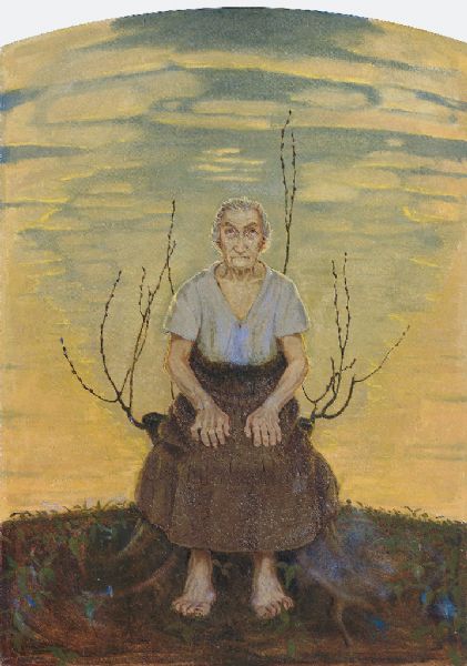 Sitzende alte Frau auf Baumstumpf vor abendlichem Wolkenhintergrund