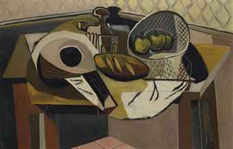 | Stillleben mit Mandoline, Fruchtschale, Wasserflasche und Brot | |