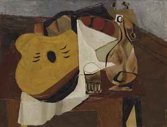 | Stillleben mit Poker, Guitarre, Glas, Flasche und Fruchtschale | |