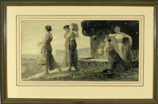 | Vier Frauen am Brunnen mit Blick auf eine Küstenlandschaft links | |
