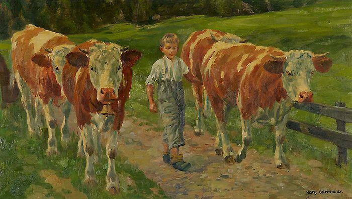 Knabe mit vier Kühen auf dem Weg zur Weide