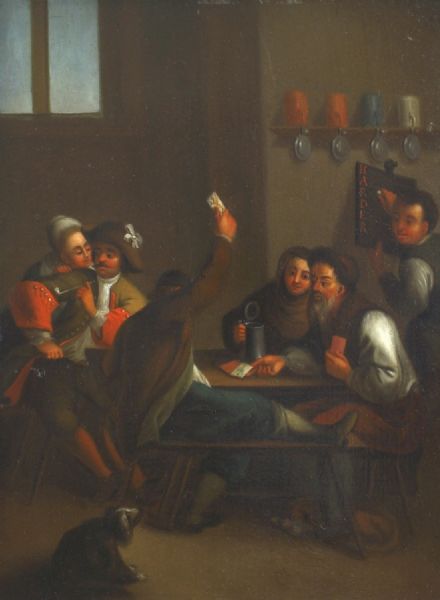 Zimmerinterieur mit trinkenden und kartenspielenden Bauern am Tisch
