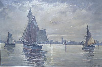 Segelboote vor einer Hafenstadt in der Dämmerung.