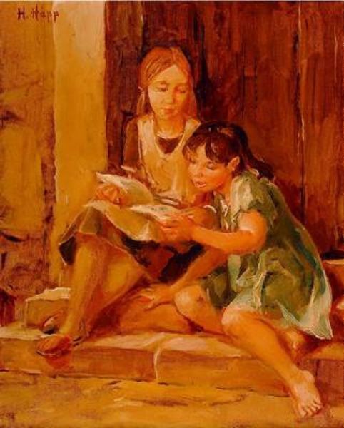 Zwei Mädchen auf der Treppe, ein Buch betrachtend