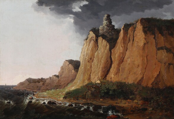 Three people by a boat near a cliff, presumably Møns Klint