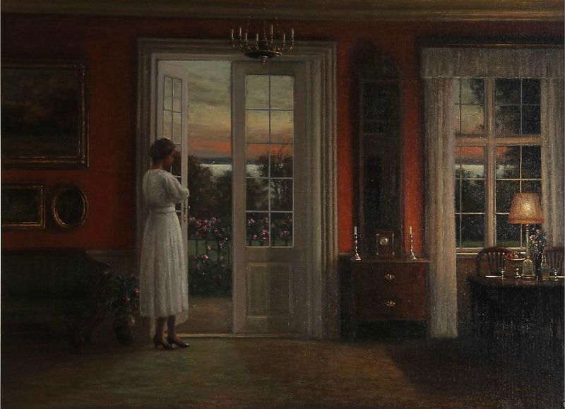 | Drawing room interior with a lady enjoying the sunset at the garden door. | |