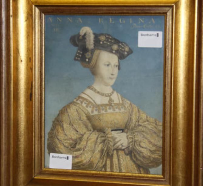 Anne Boleyn, half length, wearing a dress of gold cloth and a hat decorated with pearls