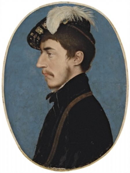 | Profile portrait of Sir Nicholas Poyntz (1510-1557), Sheriff of Gloucestershire, bust-length, in a black doublet and plumed cap | |