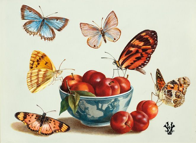 Plums in an eastern bowl surrounded by colourfull butterflies