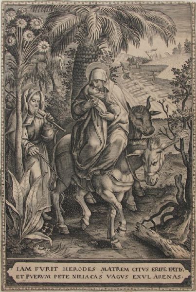Die Flucht nach Ägypten. Unterhalb zweizeiliger lateinischer Text.
