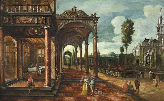 A renaissance palace and garden with various figures