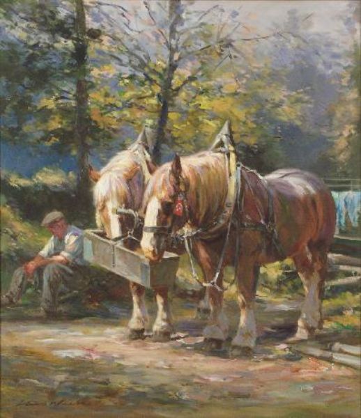 Arbeitspause, Arbeitspferde aus dem an der Deichsel aufgehängtem Haferkasten fressend