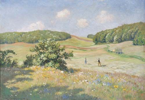 Wiesenlandschaft mit Bauern und Fuhrwerk