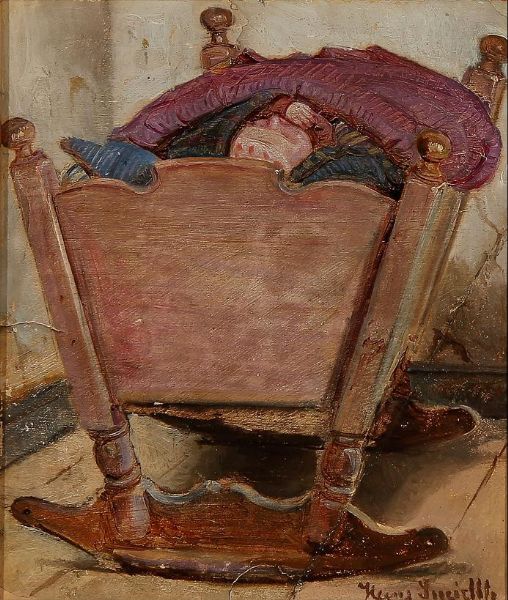 A child at rest in a cradle. Signed Hans Smidth.