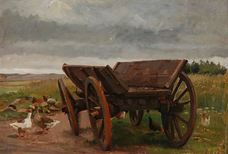 Landscape with geese and ducks around an old wagon