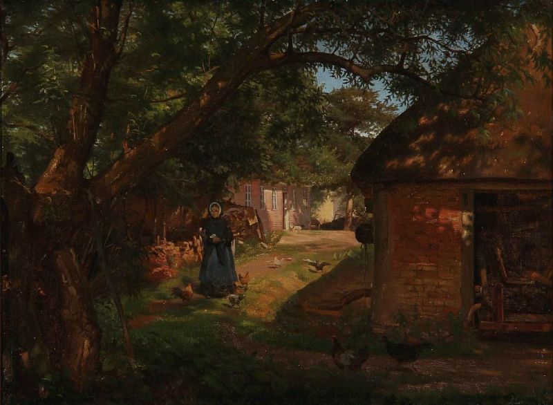 Sommer day at a farmhouse with chickens and a woman.
