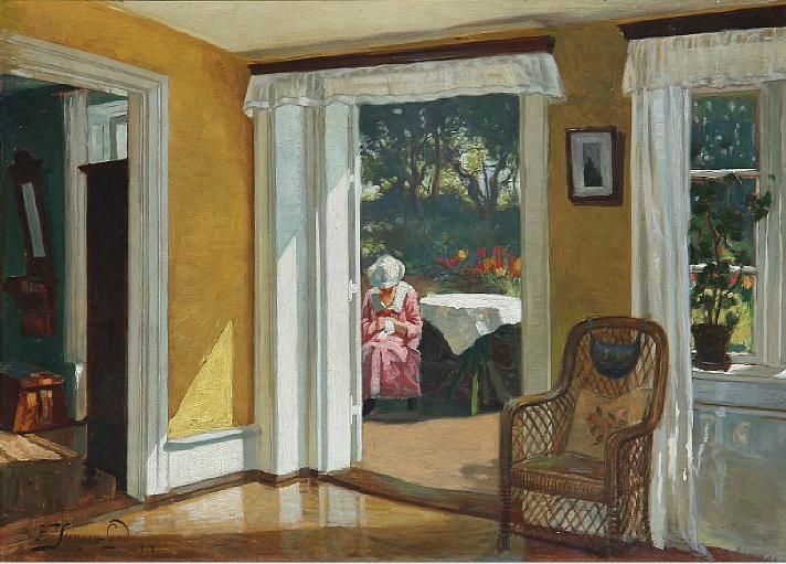 Interior with a view to a terrace with a woman in pink dress.