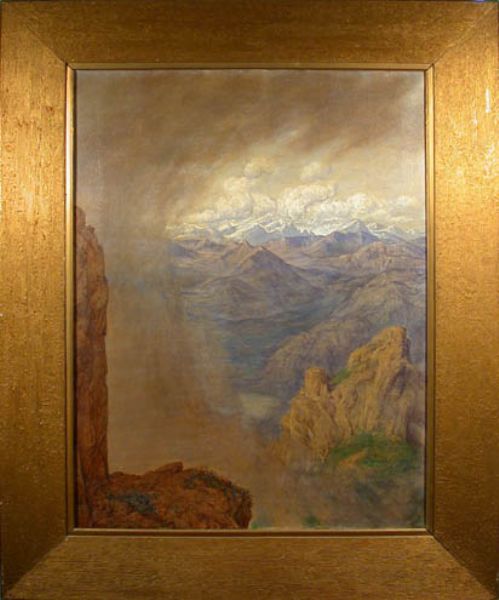 | Blick von einem Felsvorsprung über eine weite, im Hintergrund schneebedeckte Gebirgslandschaft unter dichten Wolken | |