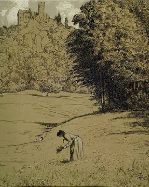 Frau beim Blumenpflücken, im Hintergrund Burg, im Druck