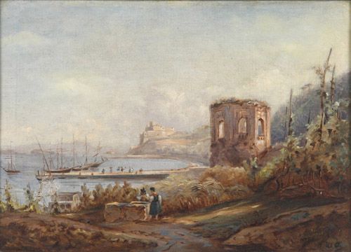 | Blick auf die Mole eines südlichen Städtchens, im Vordergrund Landleute am Brunnen | |