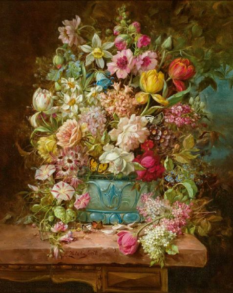 | Das meisterlich ausgeführte Blumenstilleben widmet sich der naturalistischen Wiedergabe div. | |
