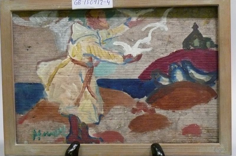 Kustmotiv med man som matar fåglar.