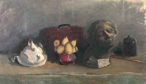 Stilleben mit Früchte und Bronzebüste. Um 1960