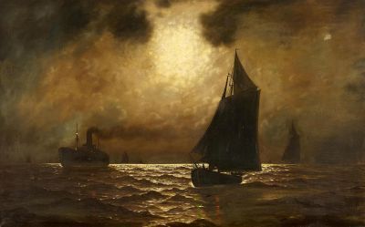 Marine mit Dampfschiff und Seglern bei Vollmond