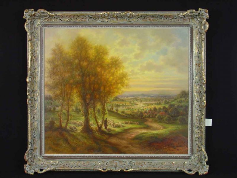 Weite Neckarlandschaft am Abend mit Hirte u. Schafherde
