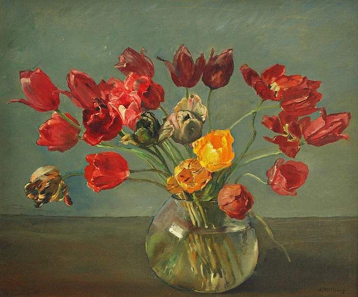 Stilleben, bunter Tulpenstrauß in Glasvase