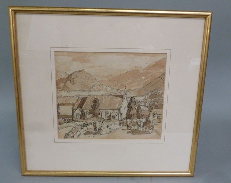 | Pen and ink, highlighted in watercolour, framed and glazed | |
