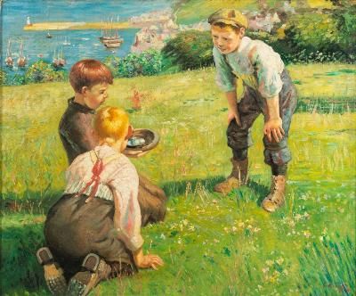 | Boys collecting birds eggs on a cliff top, view to a harbour beyond, possibly Newlyn | |