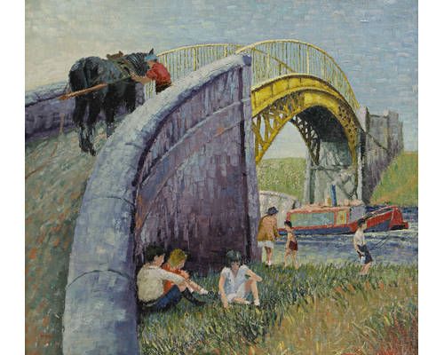 Figures by a canal bridge