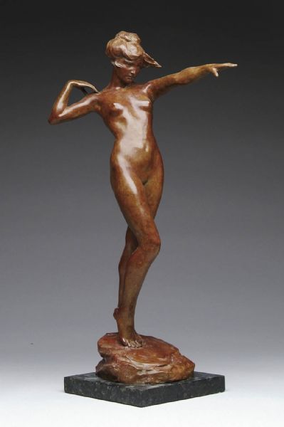 | Bronze Mottled brown patina standing nude woman has outstretched arm with the other arm touching her shoulder | |