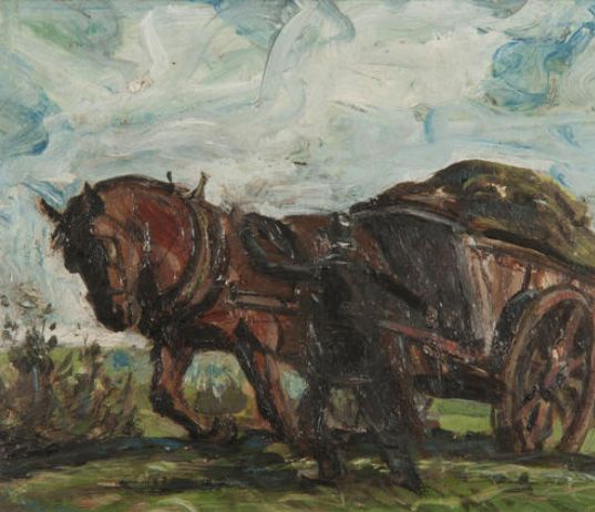 Horse and cart being led by a horseman