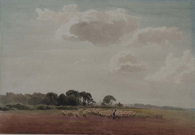 A shepherd penning a flock of sheep with woodland and farmstead in the distance