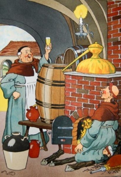 Moines soutirant et goûtant du vin dans une cave] & [Moines distillateurs