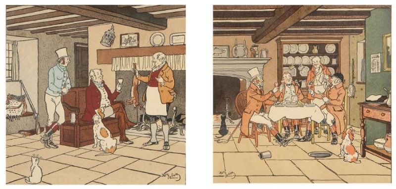 Paire de gravures en couleurs représentant des scènes de chasseurs attablés
